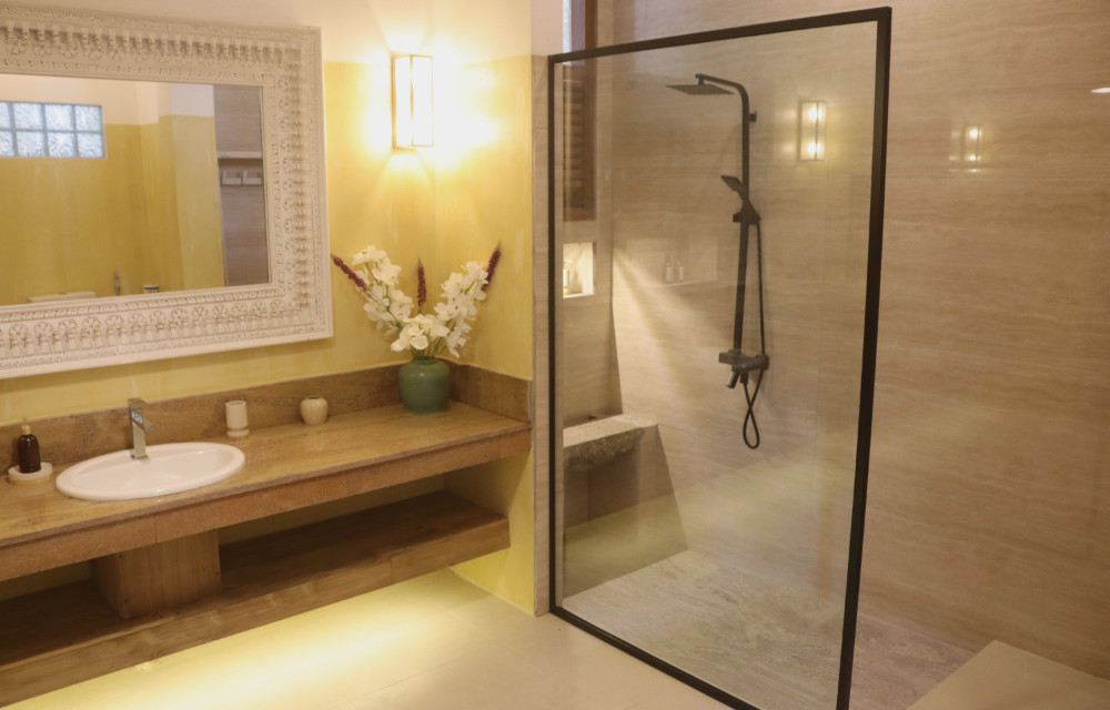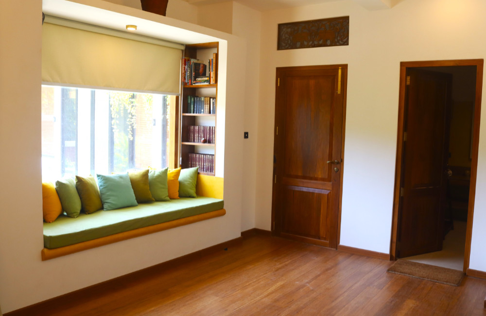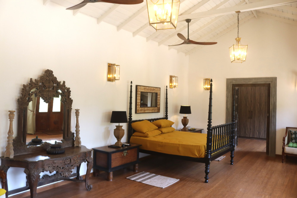 This large ground floor suite is situated in our 2 bedroomed house next to the villa ( the other room being Gardenia on the 1st floor above ).This large suite has a king size antique bed with mosquito net, window seat, 2 chairs, AC, 2 ceiling fans, tea & coffee making facilities & looks out onto a private garden & jungle beyond. The stylish, large en-suite bathroom is equipped with a walk in shower with solar hot water and toiletries. The house is ideal for guests wanting more space, privacy & 2 rooms. The house has access to the pool in the villa next door via a bridge. It has a large living space with cable TV & a fully equipped working kitchen & large private garden. The room is available to book singly or the entire house ( Frangipani & Gardenia suites ).