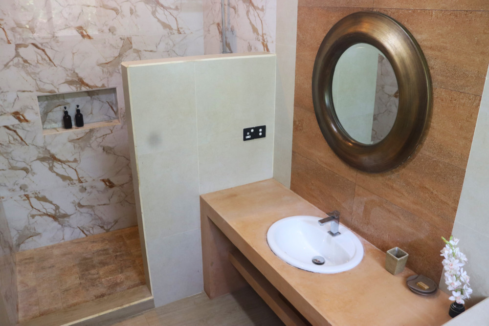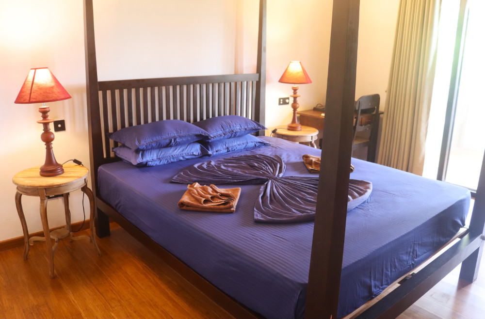 The suite has a queen size bed with mosquito net, 2 chairs, a writing desk, AC, fridge, tea & coffee making facilities.